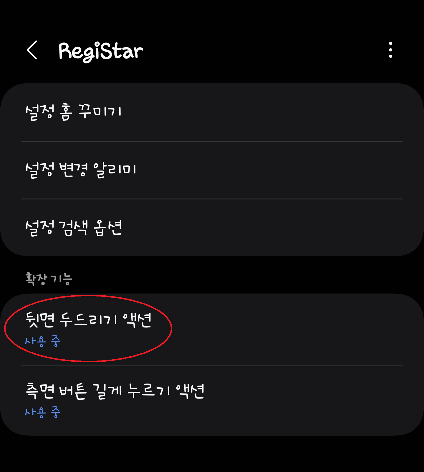 RegiStar 앱에서 "뒷면 두드리기 액션"을 들어가서 활성화하고 커스텀하면 핸드폰의 뒷면을 두드릴 때 특정 기능이 실행되도록 할 수 있습니다.