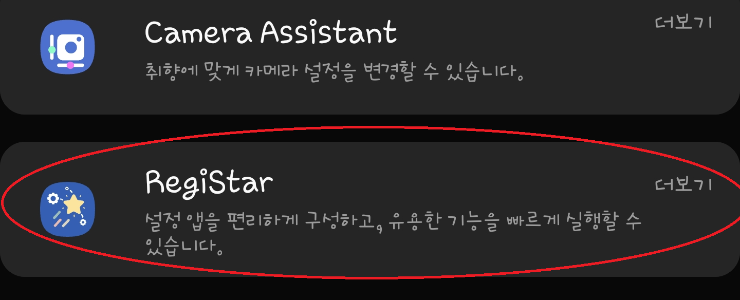 앱을 다운 받은 뒤에는 "편리한 갤럭시" 탭에서 "RegiStar"이라는 앱을 다운 받아주세요.