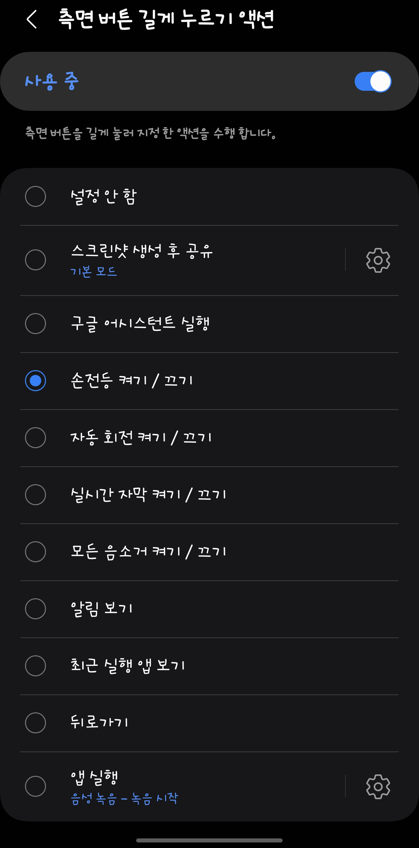 이제 전원(측면) 버튼을 꾹 누르고 있으면 선택한 기능이 실행될 겁니다.